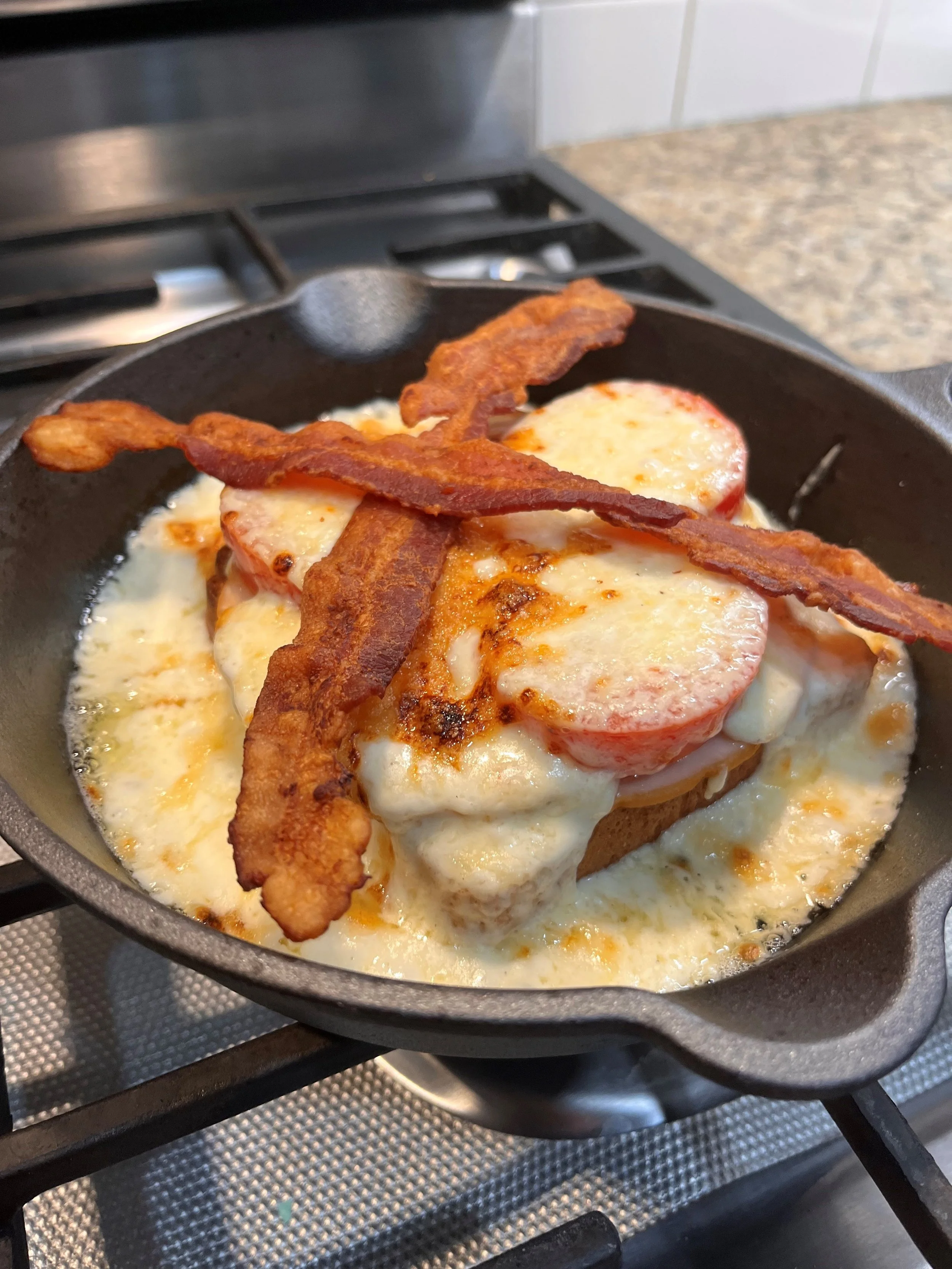 Appetizer: Broccoli and Ricotta Toast, Main Course: Baked Maple Chicken Thighs on a bed of Gruyere Cheese Grits topped with Coleslaw, Dessert: Bananas in a Caramel Sauce on Ice Cream