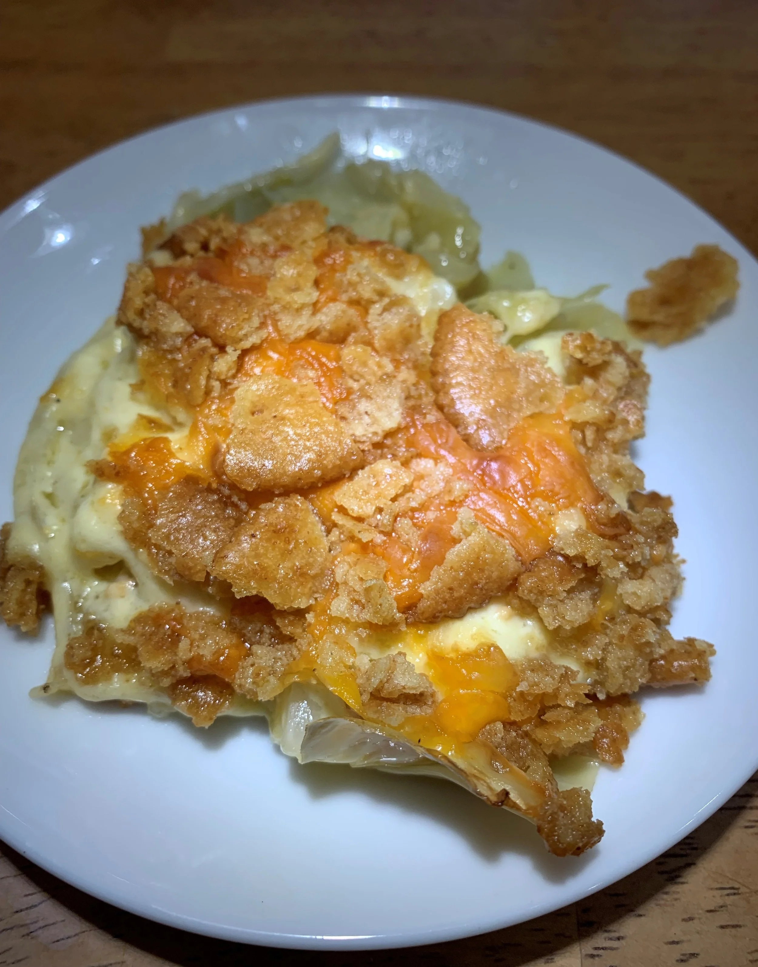 Cream of Potato Soup, Mrs. Mackey’s Chicken, Cabbage Casserole, Green Beans Casserole